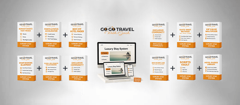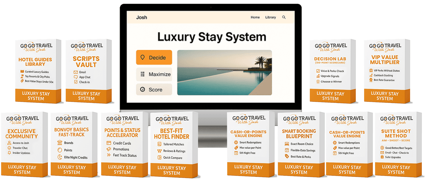 DISCLAIMER: The results and examples on this page and inside the Luxury Stay System reflect the personal experiences of Josh and select clients. They are not typical and are not promises of specific outcomes. Upgrades, savings, perks, and point redemptions vary by property, availability, season, status level, and your own effort in applying the strategies. Your results will depend on many factors including travel patterns, budget, timing, and execution. Nothing here is financial, legal, or travel advice. Marriott International and its brands are trademarks of their respective owners; this program is independent and not affiliated with or endorsed by Marriott or any other company.